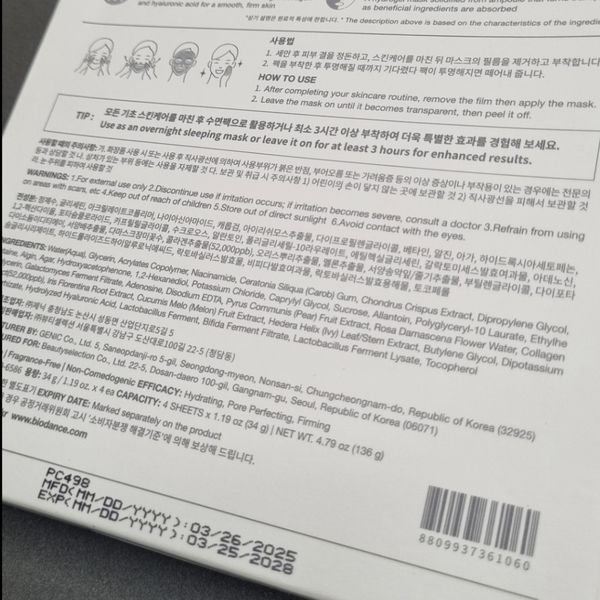 این محصول ساخت کره جنوبی است و در بسته 4 عددی عرضه میشود. هر ورق ماسک بهگونهای طراحی شده که اثر آن (لطافت، سفتی، شفافیت و آبرسانی) تا یک هفته روی پوست باقی بماند.